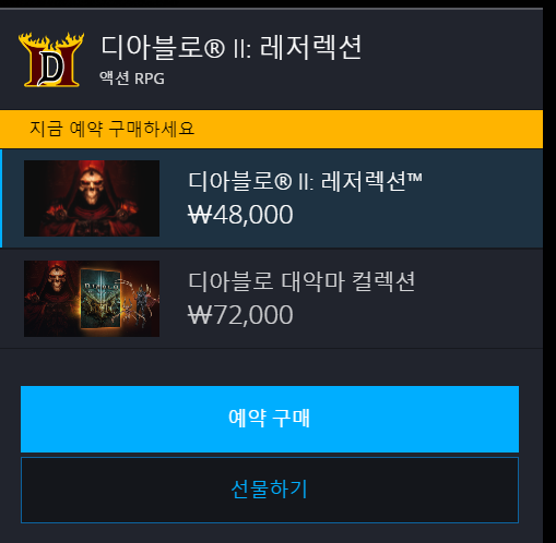 예약구매 페이지 주소에서 가능하며 48,000원, 디아블로 대악마 컬렉션은 72,000원 입니다.