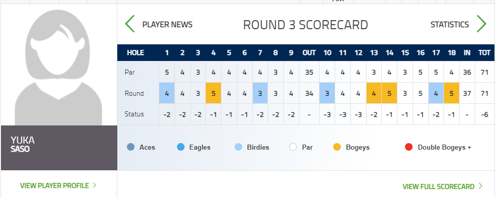 중국 국적의 선수입니다. 금일은 상당히 무난한 스코어를 기록 중인 것으로 보입니다. 대부분이 PAR를 기록했고 1번의 버디와 2번의 보기를 기록했습니다.