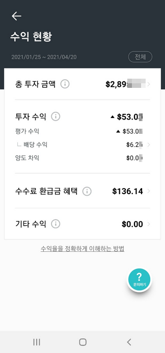 다음은 전체적인 수익 현황입니다. 뒷자리는 모자이크 하였으니 참고 부탁드립니다. 총 투자금액은 약 2900$ 정도입니다. 그중 투자수익은 53$ 정도가 발생했습니다. 그리고 투자수익과 별도로 배당 수익이 약 6$ 정도 발생했습니다. 배당금이 의외로 쏠쏠해 보입니다. 하단에 수수료 환급금 혜택이라는 항목으로 약 136$ 정도가 나와있습니다만 이거는 일종의 마케팅이라고 생각되어 볼 필요가 없다고 보시면 될 것 같습니다. 거래수수료나 계좌 개설 시 혜택 모음이라고 보시면 편할듯합니다.